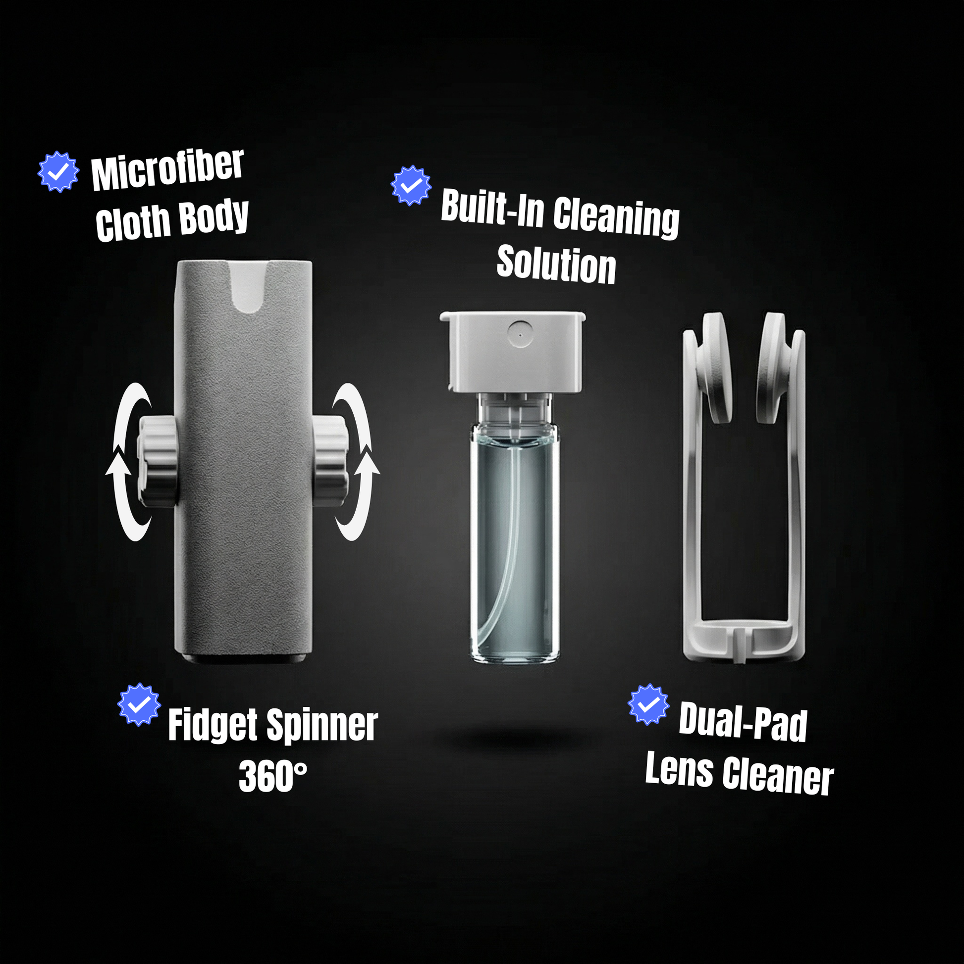 4 Tools. 1 Device. — Built-in cleaning spray, microfiber cloth, eyeglass lens cleaner, stress-relief spinner dials, and integrated storage — all packed into one pocket-sized kit.