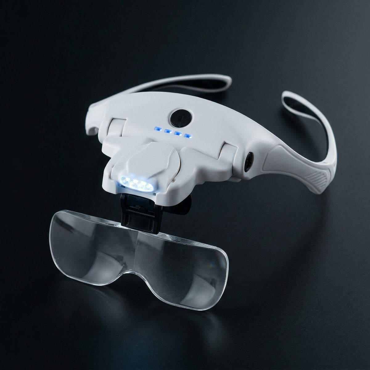 4 LEDs at eye level move with your head. The light is always on your work. Adjustable angle. USB Rechargable.