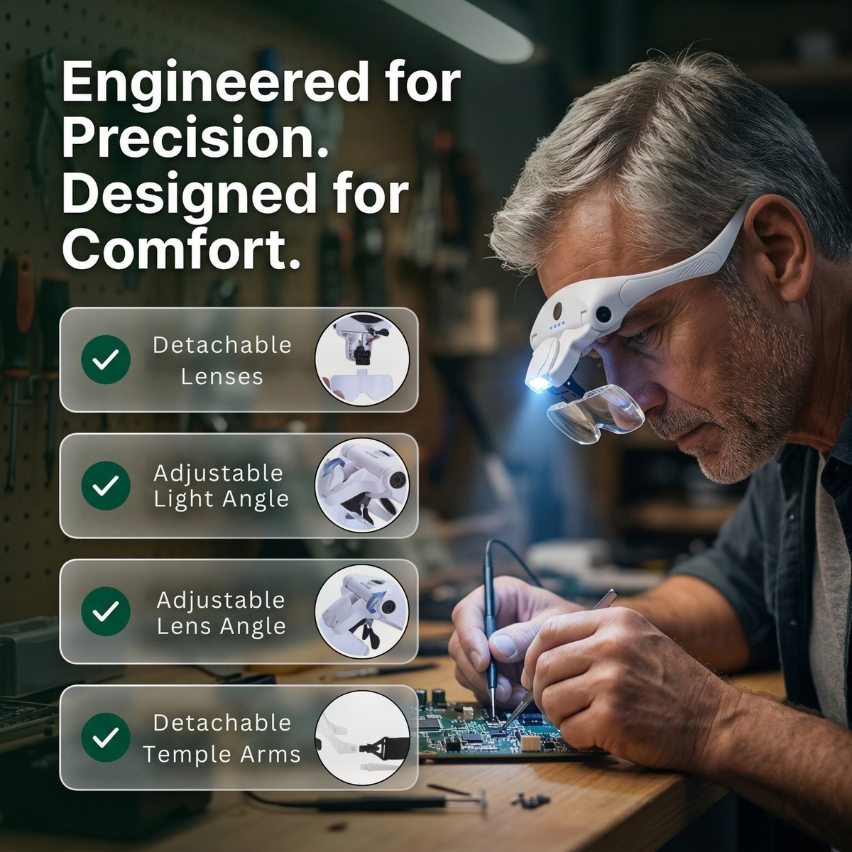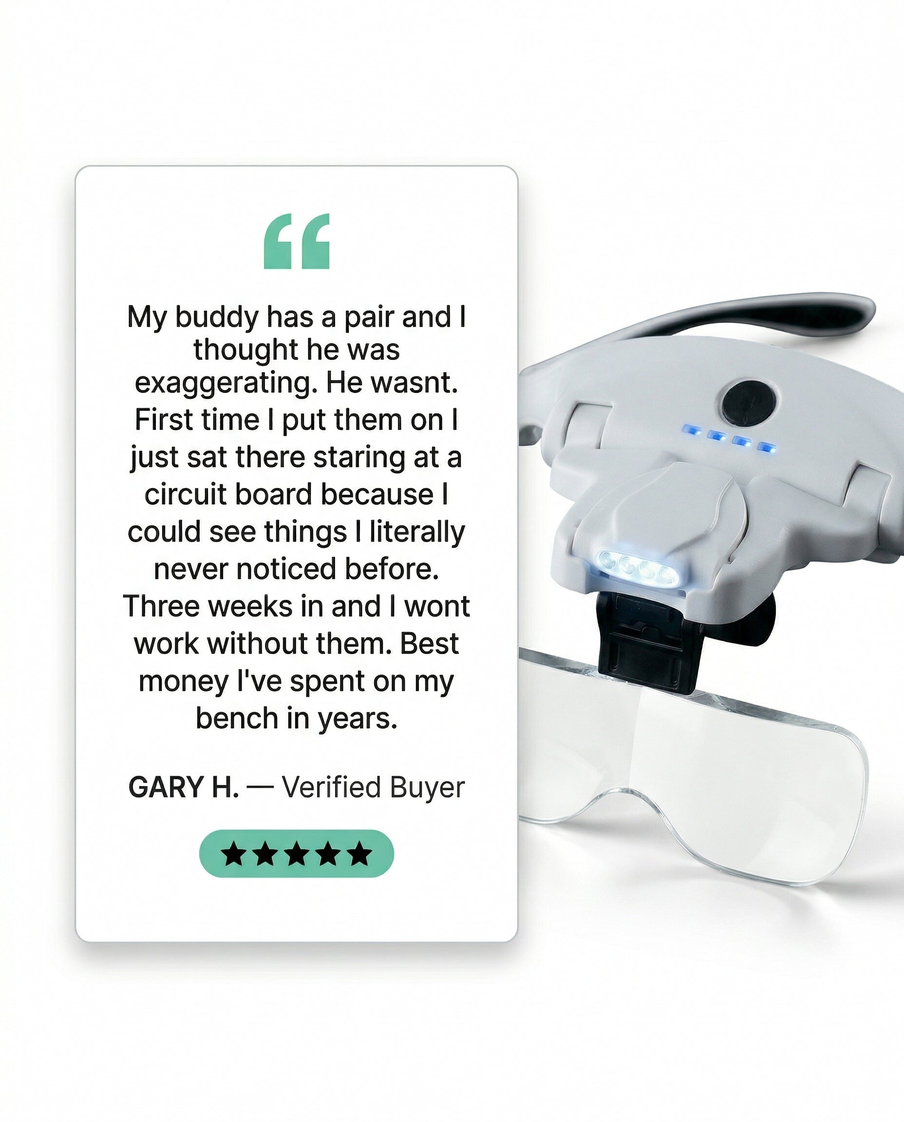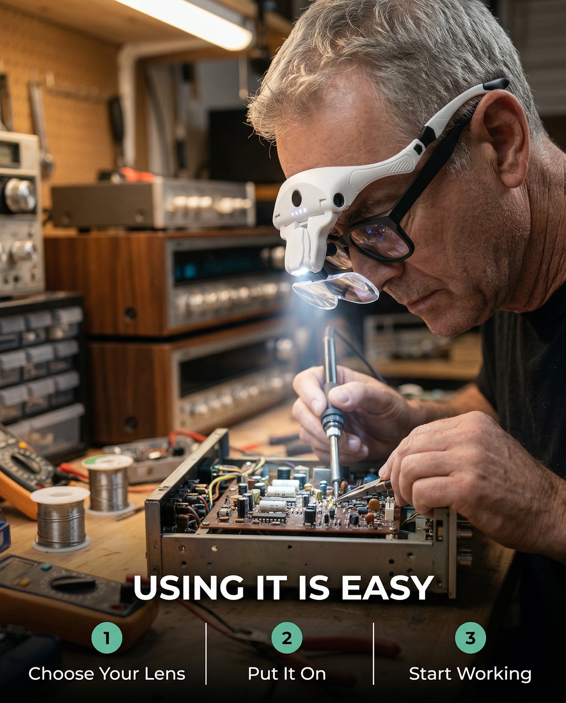 Hands-free magnifier with built-in led lights for any detail work without squinting, leaning or neck pain. USB Rechargable.