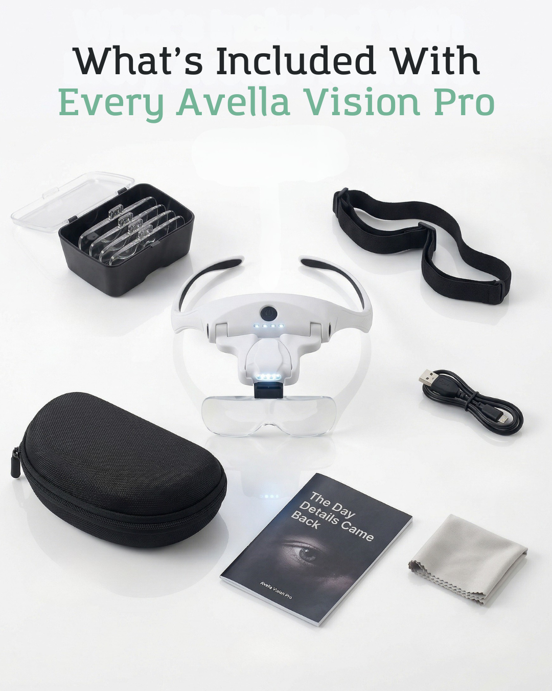 Your Avella Vision Pro package comes with everything you need for hands-free precision work: