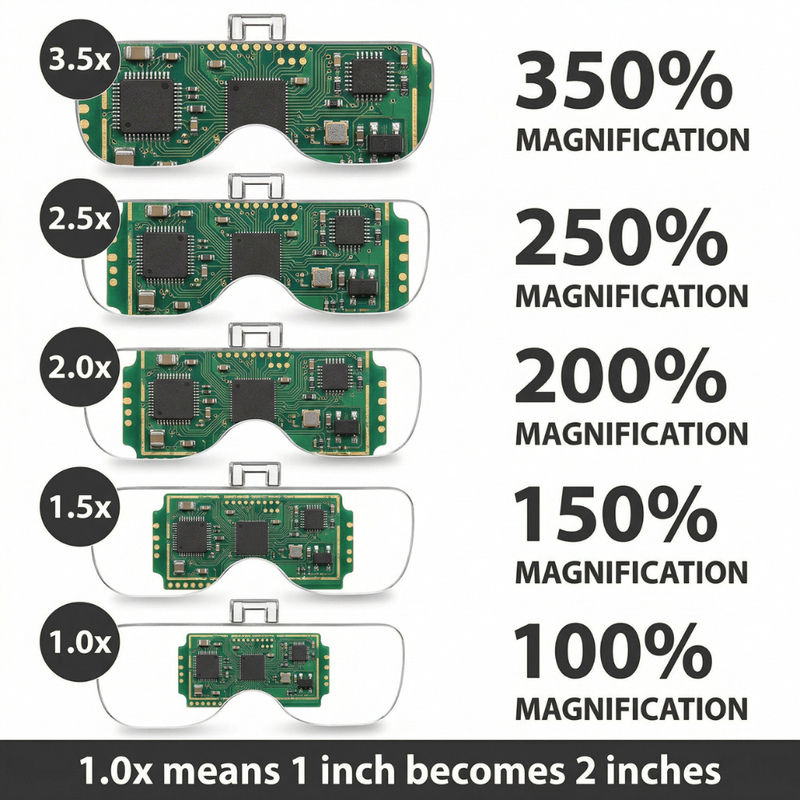 ✓ 100% (1.0x) - General Viewing ✓ 150% (1.5x) - Close-Up Work ✓ 200% (2.0x) - Crafts, Repairs And Assembly ✓ 250% (2.5x) - Miniatures, Jewelry And Fine Detail ✓ 350% (3.5x) - Micro Repair And Electronics