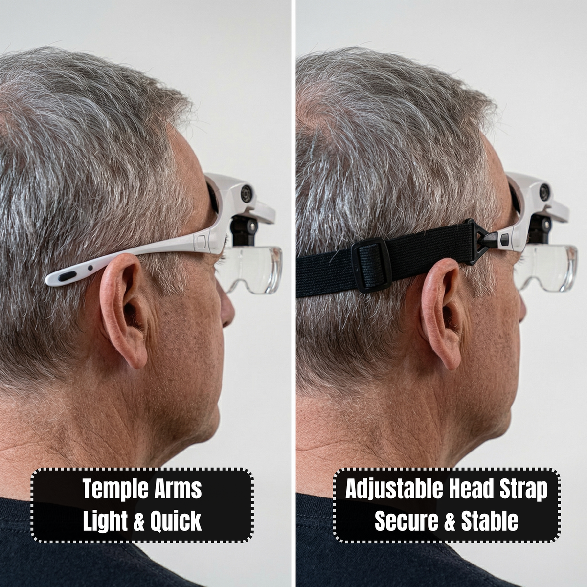 Two included - adjustable headband strap for long sessions, fixed temple arms for quick use. Switch anytime.